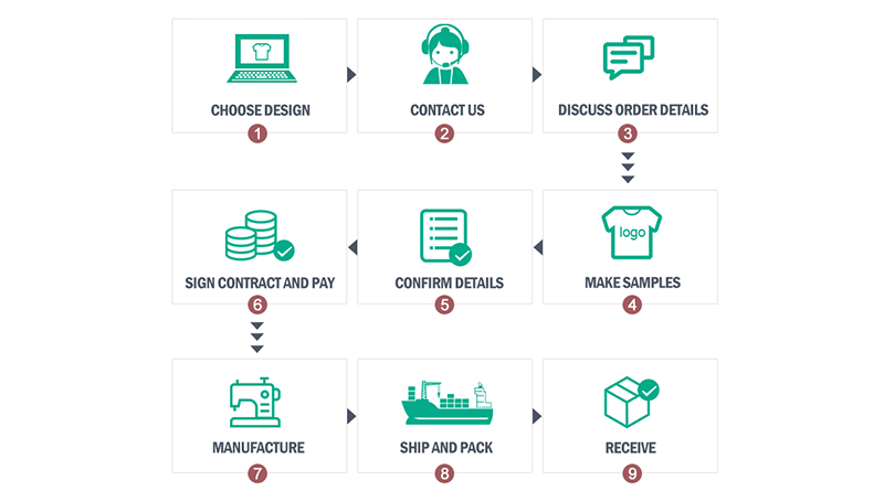 1. Choose Your Design —— 2. Contact Us—— 3.Discuss Order Details—— 4.Sample Creation—— 5.Final Confirmation—— 6.Sign Contract and Payment—— 7.Manufacturing—— 8.Shipping and Packaging—— 9.Receiving Your Order
