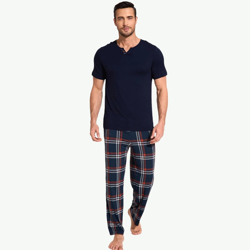Short sleeve top paired with plaid pajama pants for a relaxed and vibrant home-style. Men's pajama pants features two convenient pockets to hold some small belongs; an elastic waistband and an adjustable drawstring, ensuring a customized and secure fit.