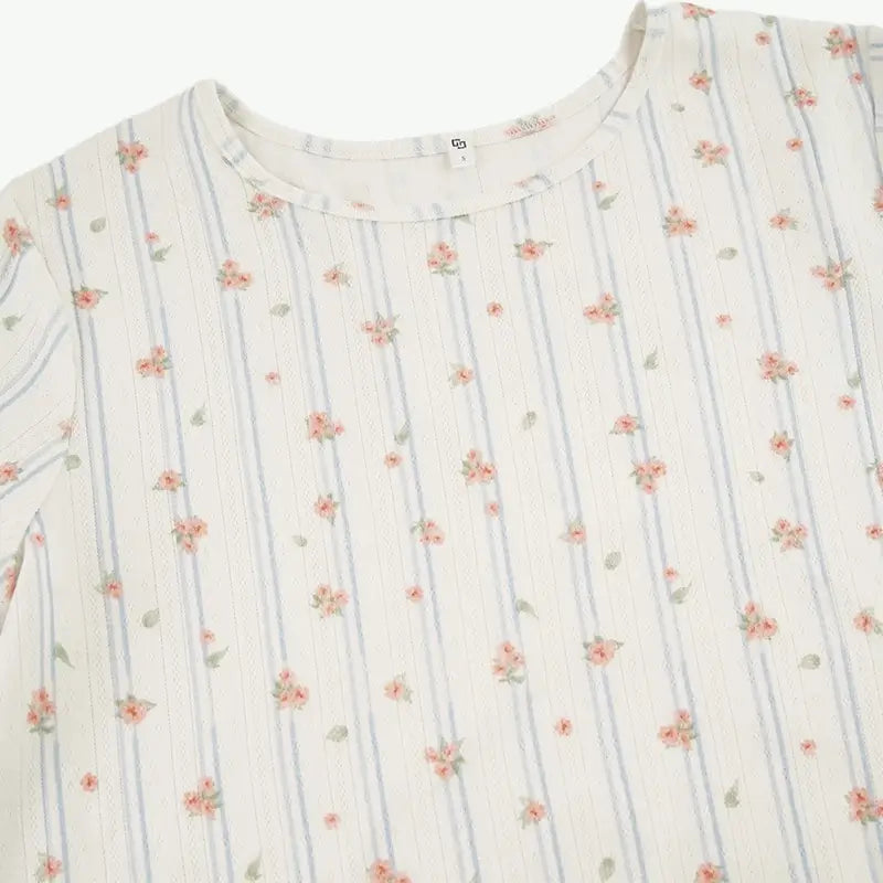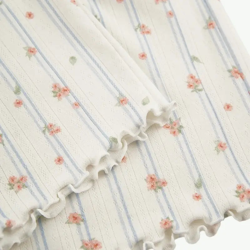 This pajama set features a long-sleeved crewneck top and matching ruffled shorts. Set against a classic vertical stripe background and accented with delicate red floral prints, it creates a gentle and youthful aesthetic. The hem, cuffs, and leg openings are finished with exquisite lettuce edge stitching, adding a touch of elegance and playfulness to the overall look.