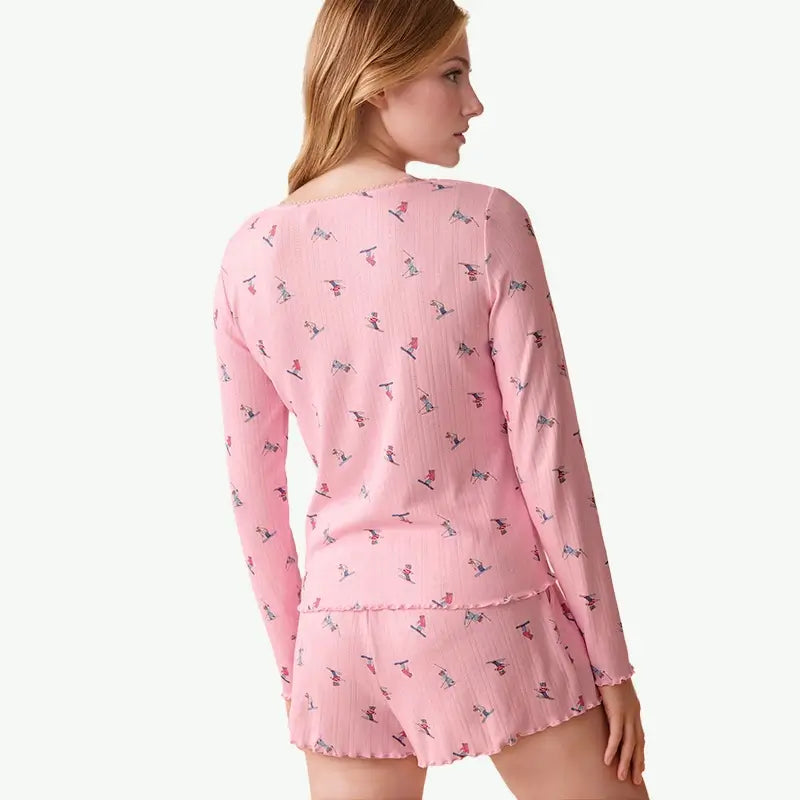 Discover our women's pink ribbed loungewear set with cute ski prints. Made from soft, breathable fabric, this loungewear offers ultimate comfort for sleep or relaxation. Ideal for retail stores and online boutiques looking for trendy women's sleepwear.